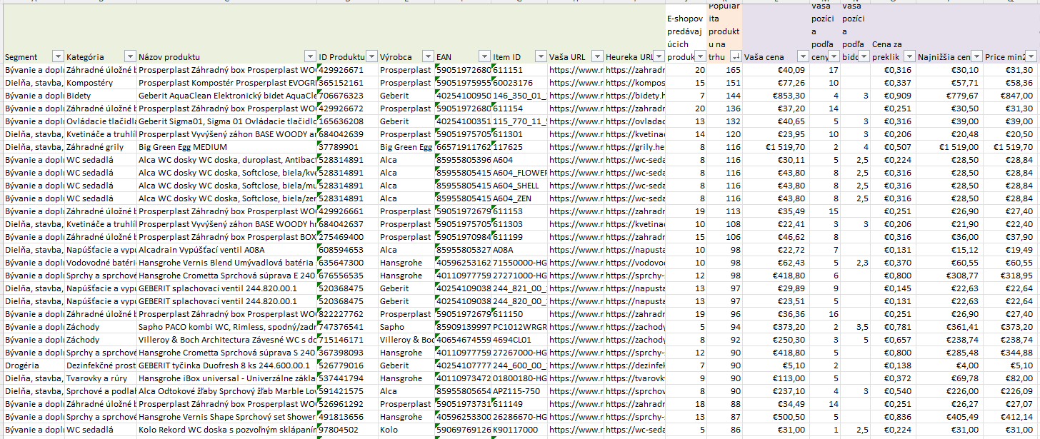 Základné produktové dáta z Heureky – report obsahuje aj základné identifikátory produktu na Heureke akými sú ID produktu (jedná sa o identifikátor produktu na Heureke, nie ID produktu na e-shope), URL adresa produktu na Heureke, Názov produktu, Výrobca, EAN kód a zaradenie produktu do Segmentu a Kategórie podľa Heureka stromu kategórií.
