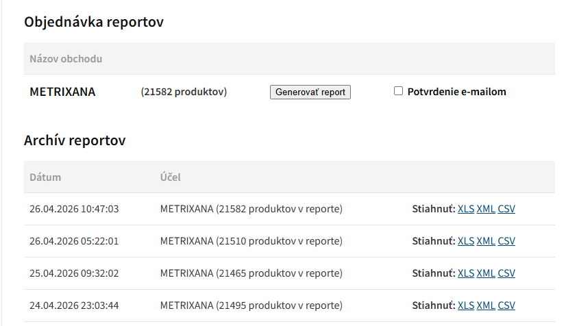 Tu nájdete možnosť vygenerovať nový Sortiment report a tiež históriu predchádzajúcich Sortiment reportov spolu s informáciou, koľko produktov report obsahuje. Sortiment report si môžete stiahnuť vo formáte, ktorý vám vyhovuje a ďalej s ním pracovať. V niektorých prípadoch sa Sortiment report generuje automaticky každý deň – ide najmä o prípady kedy e-shop využíva automatizovaný bidding ako napríklad Simple Bidding alebo Bidding Fox.