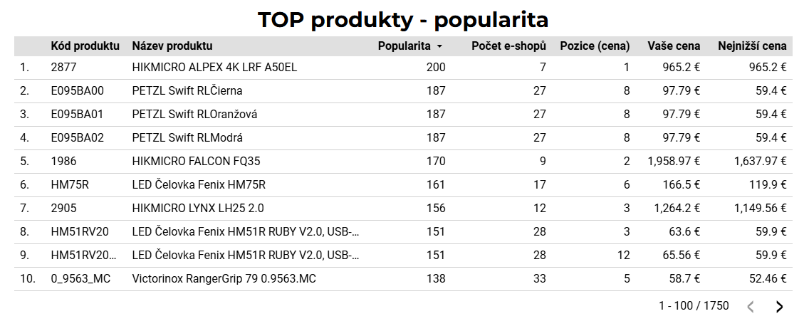 Ceny konkurencie – medzi najužitočnejšie dáta patria konkrétne ceny konkurencie (tie sú v reporte uvedené len ako čísla, bez informácií o názvoch konkrétnych konkurentov). V tomto reporte nájdeme 10 najnižších aj 10 najvyšších cien na produktovej karte.